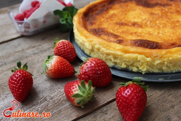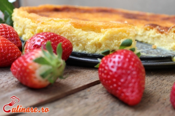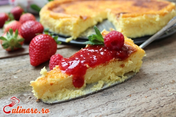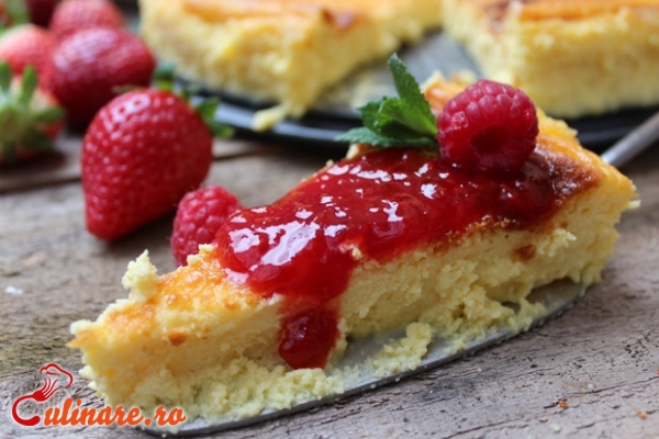 Intr-un castron mare, se bat ouale si se amesteca cu zaharul si esenta de vanilie. Se topeste untul si se toarna peste amestec. Adaugati branza dulce, smantana si coaja de lamaie. Se amesteca bine. Se unge o tava cu putin unt si se toarna compozitia obtinuta. Se lasa la cuptorul incins la 180 de grade timp 30 de minute. Cand este gata se lasa sa se raceasca si se orneaza cu gem de fructe.
