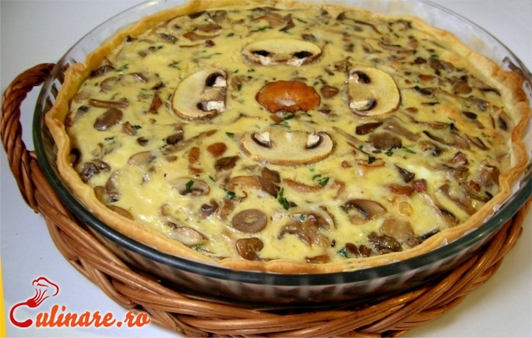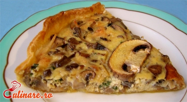 Se amesteca faina, unt, un albuns si sare pentru a face aluatul de tarta. Coca pe care o obtinem o invelim intr-o folie din plastic si o dam la frigider timp de 30 minute. Ceapa tocata se caleste in unt usor si se adauga cipercile tocate si se calesc impreuna 10 minute. Ouale se amesteca cu smantana si patunjelul tocat marunt, sare si piper. Aceasta compozitie se amestesca cu ciupercile si ceapa. Aluatul se intinde si se imbraca in forma de tarta cu un strat gros de 1 cm si se inteapa cu furculita din loc in loc si se da la cuptor la foc potrivit timp de 10 minute. Apoi adaugam umplutura si deasupra se pune cascaval ras si se mai da la cuptor 30 minute. Cand este gata se scoate din forma si se serveste calda sau rece.