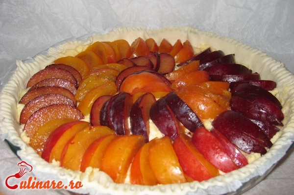 Se coace foaia de patiserie la 180 de grade, timp de 15 minute. Intr-un castron, se amesteca zaharul brun si esenta de vanilie. Apoi, se adauga coaja de lamaie, iaurtul si ouale batute. Se toarna crema peste aluat si se introduc prunele, taiate pe jumatate, in crema. Se mai coace timp de 30 de minute la cuptor! Se presara cu nuci tocate.