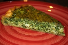 Se amesteca faina, unt, un albuns si sare pentru a face aluatul de tarta. Coca pe care o obtinem o invelim intr-o folie din plastic si o dam la frigider timp de 30 minute. In acest timp se pregatim umplutura. Ceapa se taie marunt si se pune la prajit in unt. Se adauga spanacul, sare si piper. Se tine la foc, pana cand spanacul este facut si dupa se lasa sa se raceasca. Ouale se amesteca cu smantana si patunjelul tocat marunt, branza, sare si piper. Aceasta compozitie se ameteca cu spanacul si ceapa. Aluatul se intinde si se imbraca in forma de tarta cu un strat gros de 1 cm si se inteapa cu furculita din loc in loc si se da la cuptor la foc potrivit timp de 10 minute. Apoi adaugam umplutura si se mai da la cuptor 30 minute pana se rumeneste.