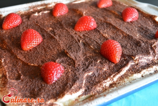 Fructele se spala bine, se scurg de apa si se taie in jumatati, apoi se presara zahar peste ele si se dau la rece pentru cateva minute. Separat se pun intr-un bol galbenusurile de ou si zaharul, apoi se mixeaza bine, la baie de aburi, pana cand devin o crema fina. Crema se lasa la racit, iar cand s-a racit complet se adauga mascarpone, se pun aromele si se mixeaza. La final se adauga si frisca batuta spuma si se amesteca usor, intreaga compozitie. Se scot capsunile de la frigider si se scurge intr-un vas mai mic, sucul lasat de acestea, care va fi amestecat cu 50 de g de zahar, vanilie si aproximativ 100 ml de apa. Piscoturile se trec pe rand prin sucul de capsuni si se aseaza ulterior pe un platou. Cand se formeaza un strat de piscoturi, peste el se toarna jumatate din compozitia de mascarpone si frisca, se pun feliile de capsuni, acoperind stratul de crema, iar deasupra se aseaza inca un strat de piscoturi inmuiate in sucul de capsuni si se intinde restul de crema. Se orneaza cu menta, capsuni sau alte fructe.