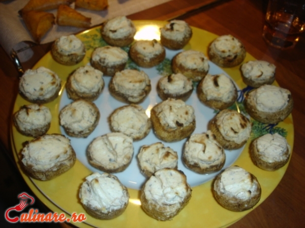 Palariile ciupercilor, spalate si scurse se pun intr-o cratita cu putin unt si se lasa pane se inmoaie. Picioarele ciupercilor se toaca, se inabuse in unt se lasa sa se raceasca si apoi se amesteca cu branza, marar, ou si sare. Cu compozitia rezultate se umplu ciupercile, deasupra se putin unt si se dau la cuptor sa se rumeneasca intr-o tava unsa cu unt. Se servesc atat calde cat si reci.