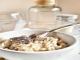 400 g orez 300 g ciuperci 1 l supa de pui 1 ceapa 2 catei de usturoi 1 pahar vin alb 75 g parmezan 70 g unt smantana sare piper