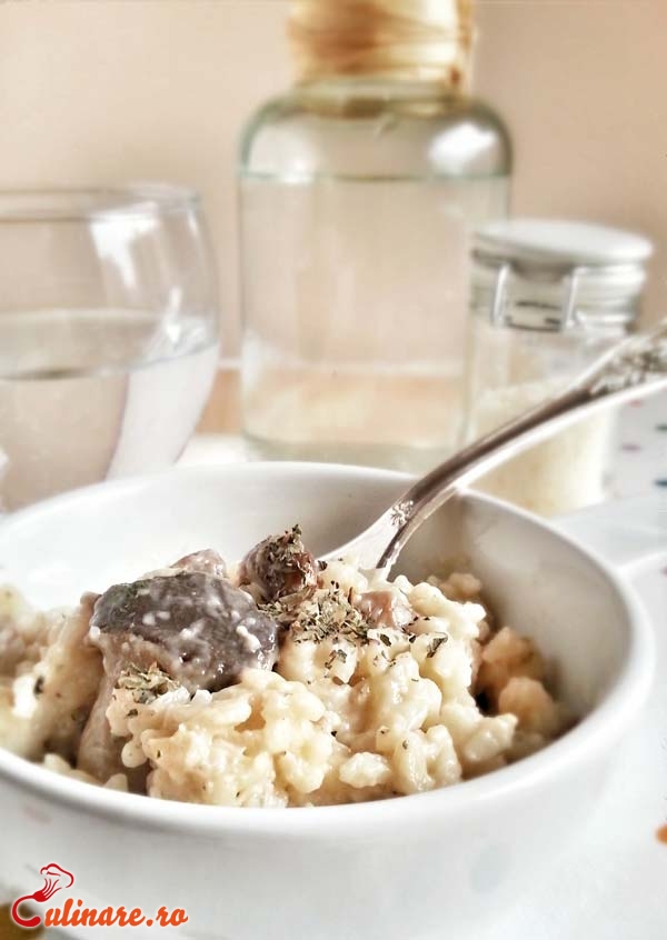 Intr-o tigaie, se pune ceapa tocata la calit impreuna cu usturoiul si putin unt. Dupa 2-3 minute, se includ si ciupercile tocate si se mai gatesc cateva minute. Apoi, se adauga orezul si paharul de vin alb impreuna cu supa de pui, amestecand constant, aproximativ 15-20 de minute. Cand orezul devinde fraged si capata o textura cremoasa, se stinge focul si se rade parmezan si se pune putina smantana.