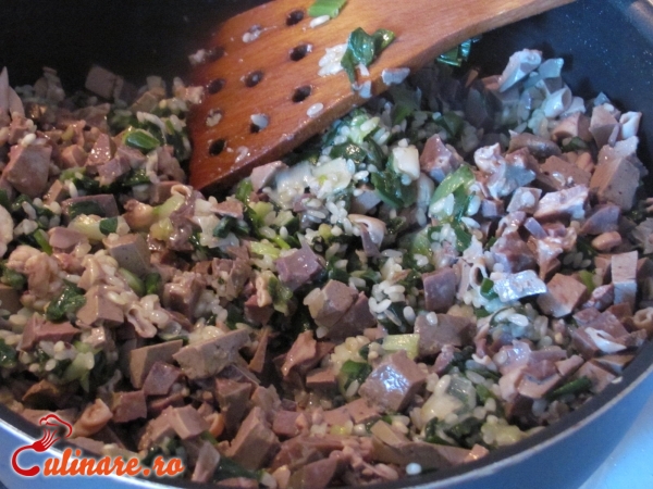 maruntaiele de la un miel (inima, ficat, plaman si rinichi) 5 oua pesmet 2 felii de paine patrunjel marar ceapa verde ulei sare piper prapur de miel (optional)