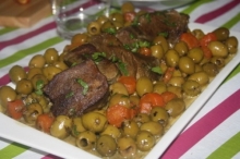 6-8 felii limba o ceapa de marime medie 50-100 ml untdelemn o foaie de dafin 25 grame faina 100 ml vin 150 ml suc de rosii 30 de masline 3-4 felii de lamaie fara coaja 10 boabe de piper o lingurita cu mustar 1/4 l supa in care a fiert limba