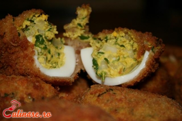 Se rumeneste usor faina in unt, se adauga cate putin lapte amestecand mereu, pana cand totul se ingroasa ca o crema. Se ia de la foc, se adauga doua galbenusuri crude, se amesteca bine punand sarea, verdeata si ouale rascoapte tocate nu prea marunt. Se amesteca si se rastoarna pe o farfurie unsa cu unt sau untdelemn. Dupa ce compozitia s-a racit, se ia cate o lingura plina, se dau prin pesmet, dandu-le forma de ou intreg, apoi se trec prin albus batut si din nou prin pesmet. Se prajesc in unt sau untdelemn si se scot din tigaie cu lingura de spuma cand sunt gata. Se aseaza pe o farfurie si se presara cu verdeata tocata.