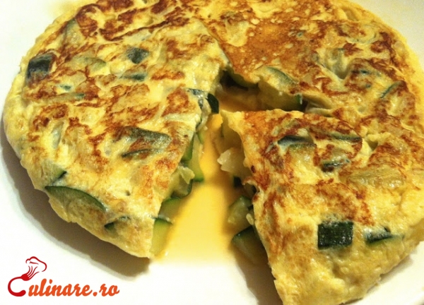 Se bat ouale. Apoi, se curata dovlecelul, se taie felii si se condimenteaza cu sare. Intr-o tigaie, se pune putin unt si se rumenesc putin feliile de dovlecel. Apoi, se aduaga ouale batute impreuna cu 3 linguri de lapte, sare si piper. Dupa ce se incorporeaza ingredientele, se intoarce si pe partea cealalta. Se presara parmezan peste omleta obtinuta si se serveste calda.