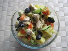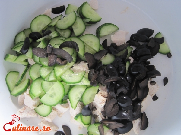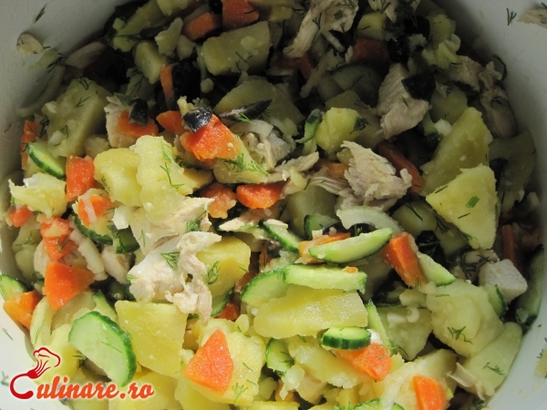Cartofii si morocovul se fierb in apa cu sare si se taie cartofii cubulete. Ceapa si castravetii se taie in felii subtiri. Ouale se fierb si dupa se taie felii. Pieptul de pui se fierbe si se taie bucatele mici. Patrunjelul se toaca marunt. Castravetii se amesteca cu cartofii, ceapa, maslinele, pieptul de pui, morocovii, patrunjelul verde, ulei, otet si sare. Se serveste rece.