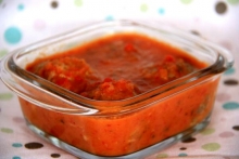 Ceapa si usturoiul se toaca marunt, apoi se pun impreuna la calit in ulei incins. Se toaca si ardeiul in cubulete mici si se adaiga peste ceapa si usturoi. Cand s-au innabusit legumele, se adauga si sosul de tomate si un pahar de apa. Se condimenteaza totul cu sare si piper si se lasa panacand sosul capata consistenta. La final se preasara patrunjelul si se serveste alaturi de chiftelutele deja gatite.