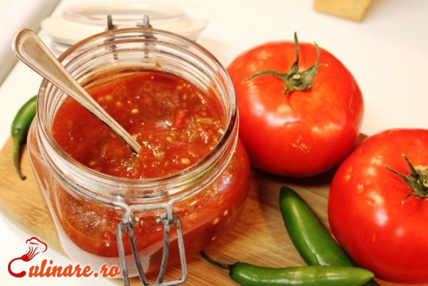 6 rosii 3 cepe rosii 2 ardei iuti 1 lamaie coriandru 40 ml ulei de masline sare piper