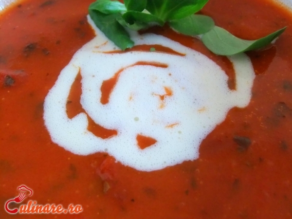 Se incalzeste uleiul de masline si se lasa la rumenit ceapa, la foc mediu, pana cand devine transparenta. Se aduaga usturoiul, cimbru si frunzele de dafin. Se amesteca si se mai prajesc timp de 2 minute. Apoi, se adauga rosiile tocate, putin zahar, sare si piper. Dupa ce amestecati bine, se toarna supa de pui si se aduce la fierbere. Se stinge focul, se acopera si se lasa 10 minute deoparte. Se scot crengutele de cimbru si foile de dafin si se amesteca cu blenderul. Se mai pune supa obtinuta pe foc, se adauga smantana si se presara parmezan ras.