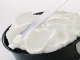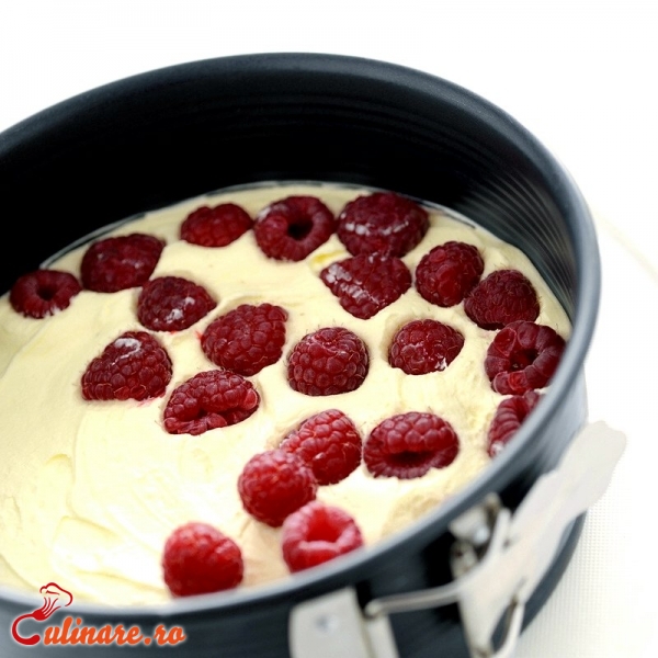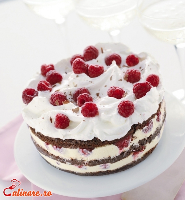 Pentru blat, se bat albusurile spuma, iar galbenusurile se mixeaza bine, cu zaharul. Ciocolata, de preferinta alba, se topeste la baie de aburi, iar peste ea se adauga treptat,untul si galbenusurile batute si se incorporeza amestecand mereu. Se adauga si albusurile spuma, impreuna cu faina si se amesteca bine, rezultand o compozitie moale, cremoasa. Se pregateste o forma de tort, tapetand-o cu unt sau hartie de copt si se toarna compozitia, apoi se da tava la cuptorul incins, timp de 30 de minute. Cand e gata, blatul se lasa la racit, se taie in doua foi de blat, apoi se monteaza tortul. Astfel, pe prima foaie de blat se intinde gemul de zmeura, peste gem se aseaza cea de-a doua foaie, iar deasupra se intinde frisca. La final, se aseaza zmeura proaspata deasupra, ornand tortul. Inainte de a fi servit, tortul va sta la rece cel putin doua ore.